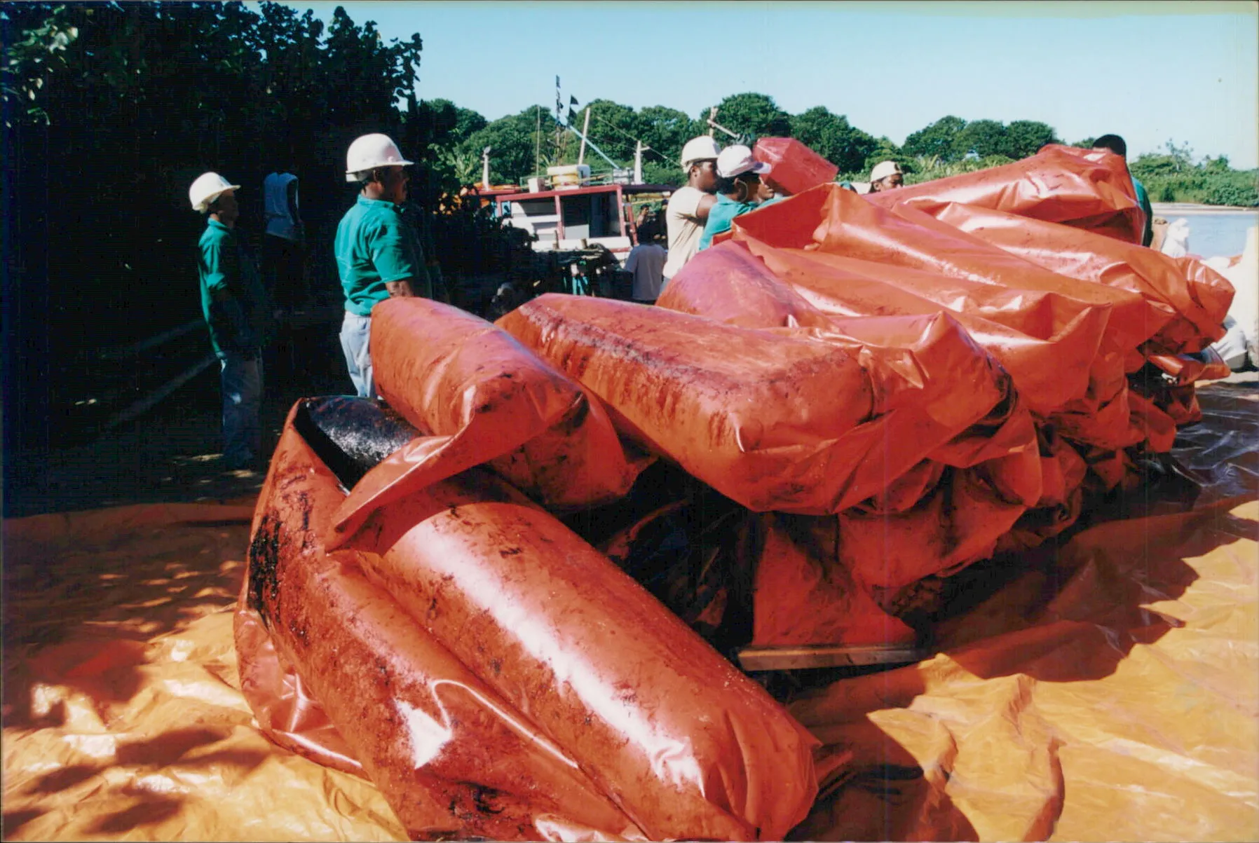 Boias utilizadas para proteger a contaminação do óleo na vegetação costeira.