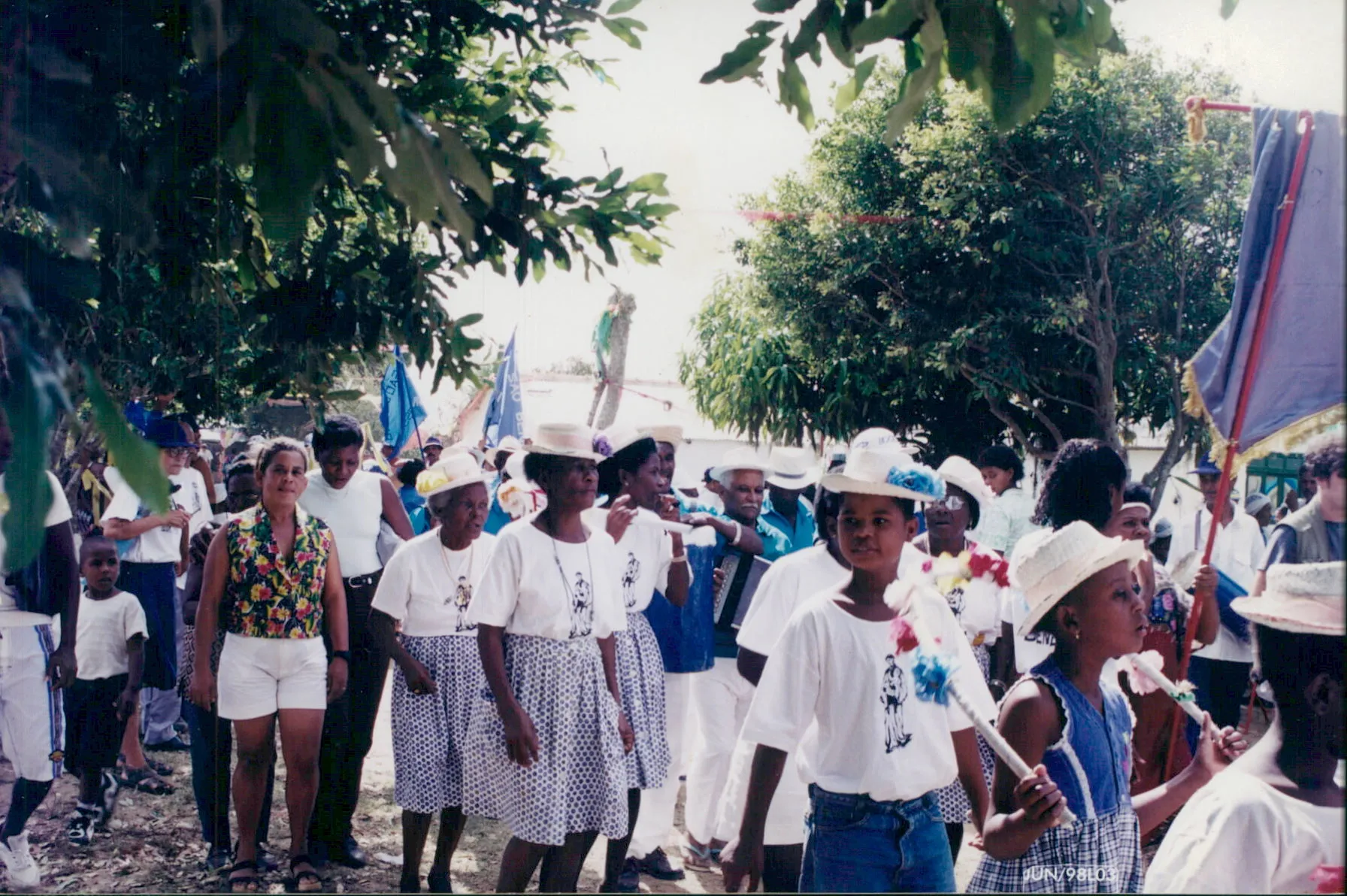 Banda de Congo do Espirito Santo em cortejo pelas ruas até a praça de Regência.