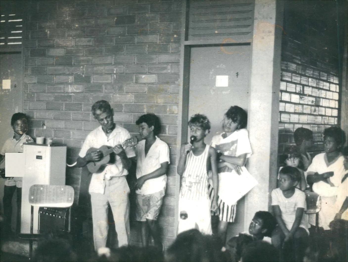 Sr. Miúdo, morador antigo da comunidade, faz apresentação musical ao som do cavaquinho, na Escola Vila Regência.