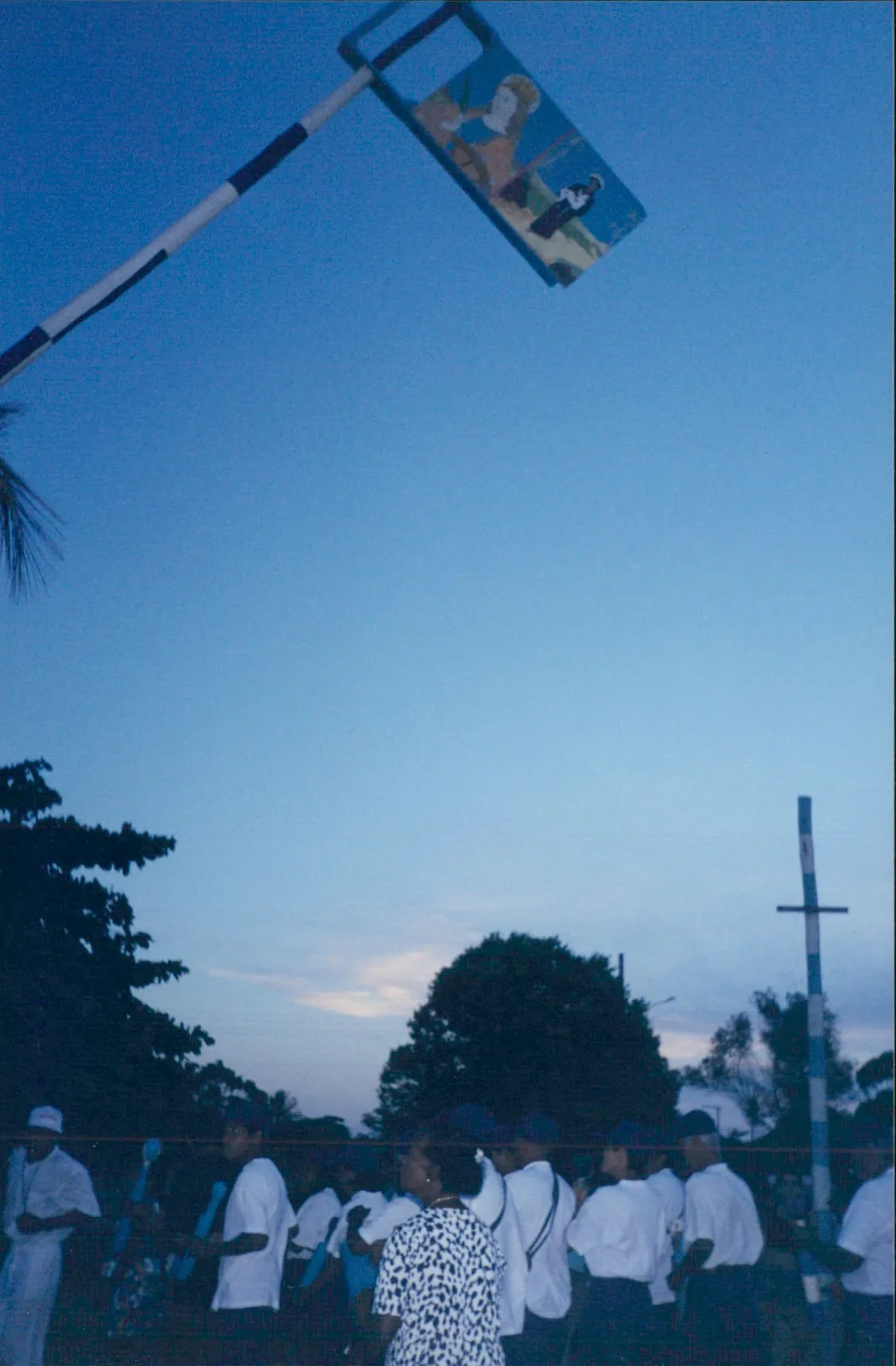 Mastro com a bandeira de São Benedito e Santa Catarina, sendo fixado no pátio da Igreja Católica em Regência
