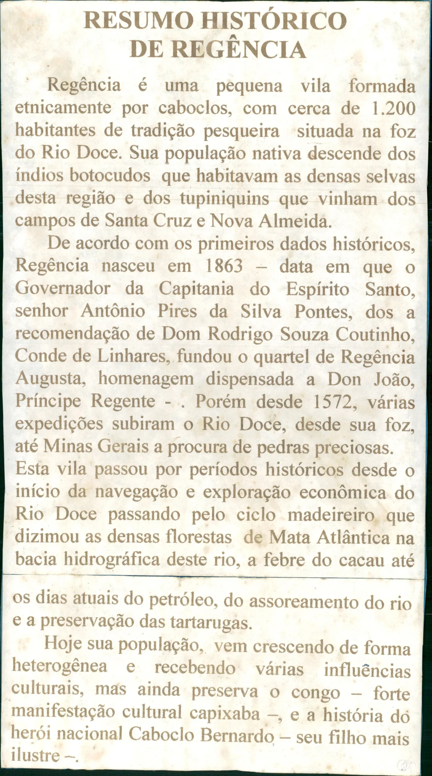 Cópia do texto com resumo hístórico da comunidade de Regência.