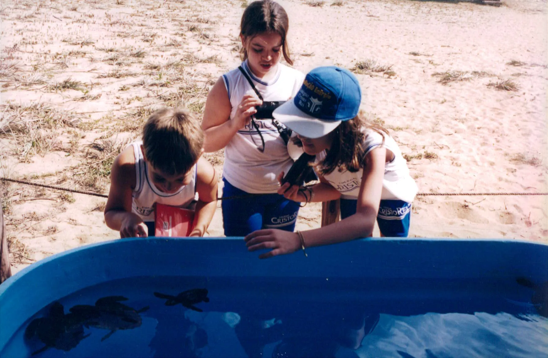 Crianças observam os filhotes de tartarugas marinhas dentro dos tanques, na base do Projeto TAMAR em Regência.