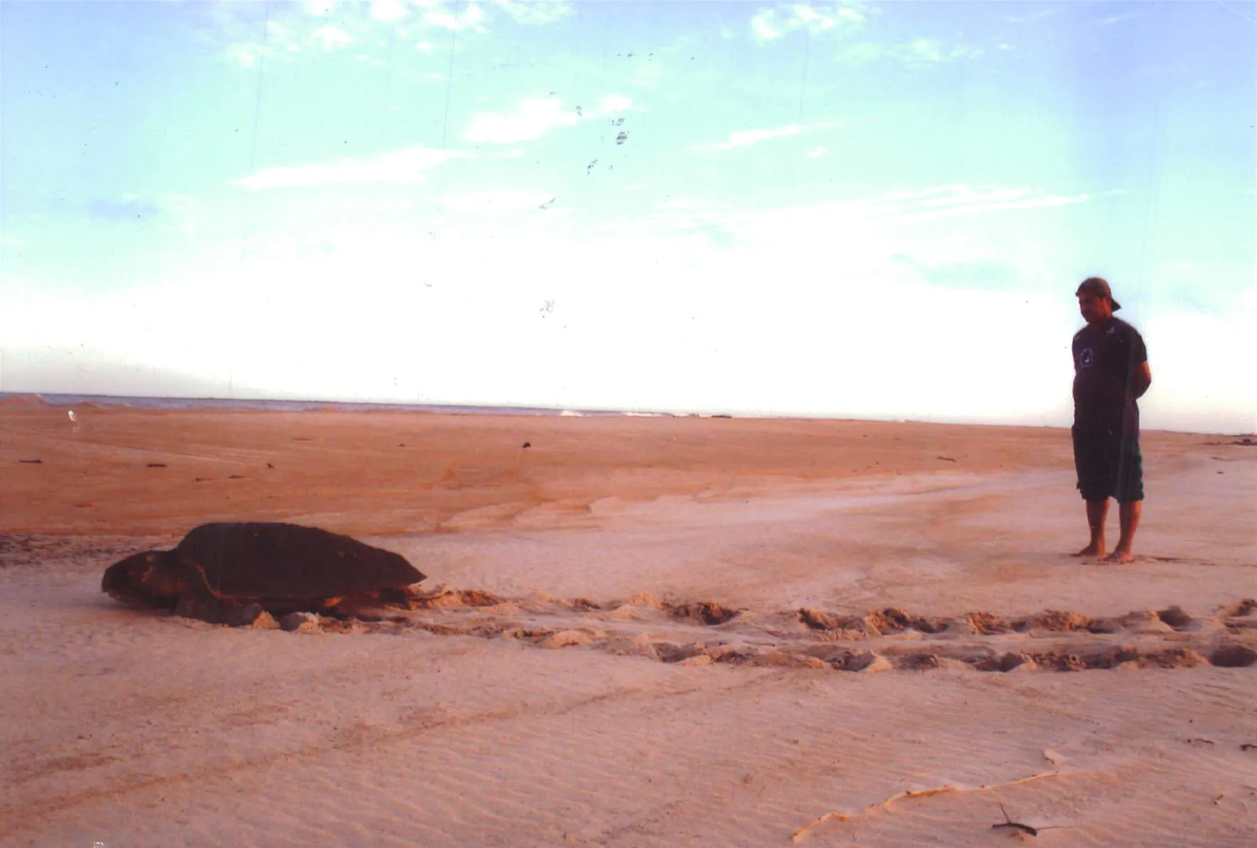 Carebeiro Rildo, observando a tartaruga conhecida popularmente como Tartaruga-cabeçuda ou Tartaruga-mestiça, deixando seus rastros na areia e retornarndo para o mar em Regência.