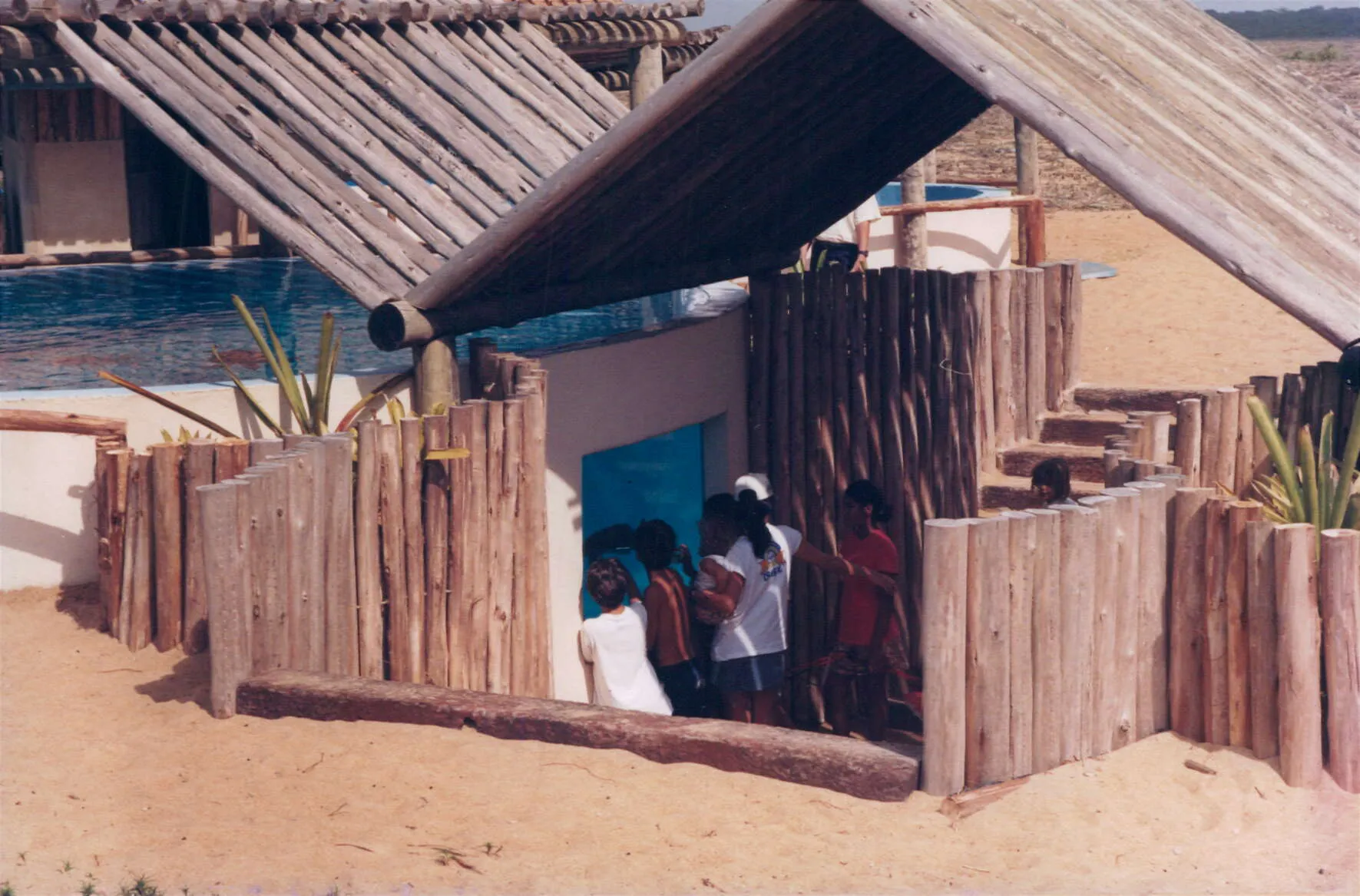 Pequeno grupo observa as tartarugas no tanque com visor de vidro.