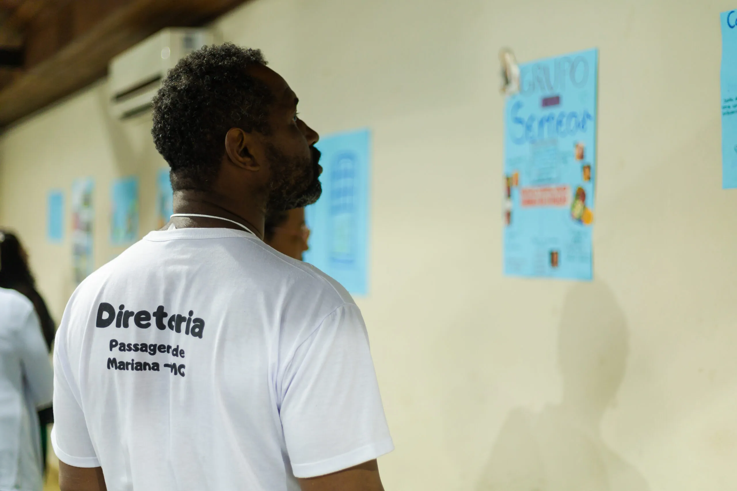 Representante Bloco do Boqueirão observando cartazes da Terceira Dinâmica.